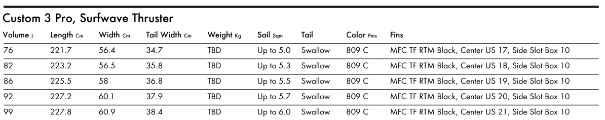 FG: Where would you position the Custom Thruster in the line? MB: Between the Custom 4 and the ONE. The initial design objectives focused on maintaining its wave riding performance in a wider variety of conditions. But as the line increases in sizes, we noticed more and more people loving the Custom 3 for bump & jump riding, which drove us to focus on refining some of the low end and speed characteristics to plane earlier, jump higher, and still get to those radical turns that stay with you.