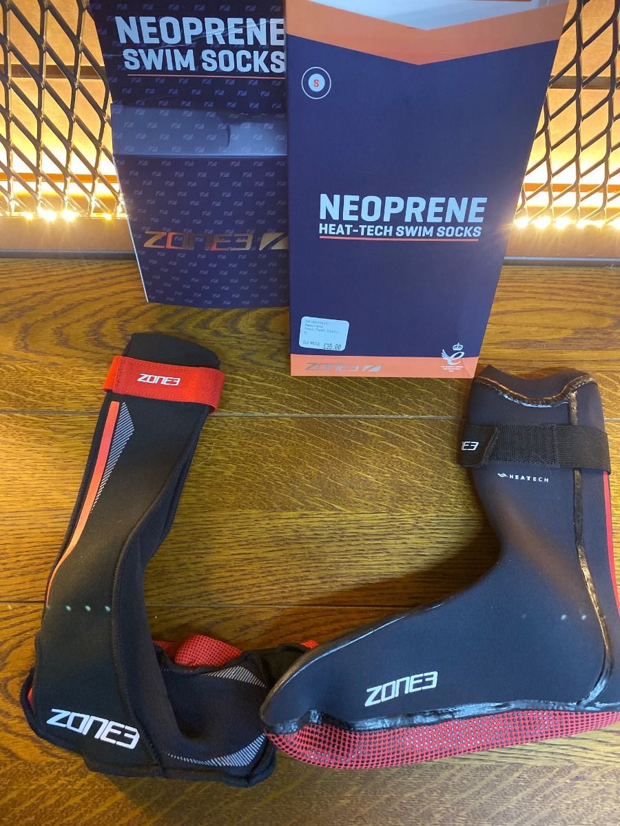 Keeping your feet warm should be a key consideration and we also see demand in this area from customers looking for a little protection from rough surfaces as you get into and out of the water. It is impossible to use anything with a thick sole as while this would be preferable from a protection perspective it would negatively affect the swim kick technique. For those looking for thermal protection the Zone3 range are stand out products. As is the situation with gloves their standard 2mm swim sock is an excellent season extender, using glued seams and lightweight sole. For those looking for more serious warmth the 3.5mm heat tech version is preferable, using thicker neoprene and fully sealed liquid taped seams to all but eliminate cold water flush. Both use a longer ankle cuff with Velcro closure to ensure great integration with the suit. This is especially important with triathlon specific wetsuits, which tend to be cut to finish several inches above the ankle.