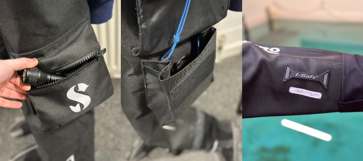 The Scubapro Definition HD has a range of remarkable characteristics, but what really caught my attention was the excellent craftsmanship, effortless wearing experience, the slimline boots, easy access pockets, and the secure I-safe straps. This drysuit is constructed with a durable trilaminate design that is stitched, glued, and double waterproof taped for maximum reliability. The suit is designed with a diagonal zip and telescopic body, making it incredibly easy to put on and ensuring maximum comfort once it's in place. The slim-line boots are integrated into the suit and boast soft protective soles, providing exceptional grip even on uneven surfaces. Additionally, the boots are equipped with Velcro ankle straps, effectively preventing any unwanted air from sneaking in. The suit is designed with two thigh pockets that have spacious Velcro openings, along with a convenient small zipped section on the front - this is ideal for carrying a compact torch. Additionally, the large Velcro sections are equipped with a couple of blue bungee loops, allowing you to easily attach and secure various items. The I-Safe straps on each wrist offer an excellent solution to keep your dive computer or compass secure. With its simplicity and effectiveness, you can trust that your valuable dive computer will stay safe and sound.