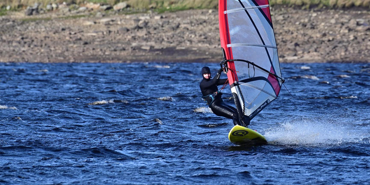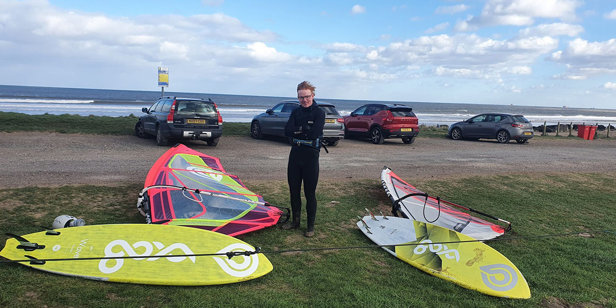 A session that always stands out to me is when I was very much still learning to windsurf, me and my best friend Tom were up at Grimwith waiting for wind in the summer. It got to around 5pm and we were getting ready to pack it all in but this amazing 15-20mph breeze came through and we stayed out until it got dark. It’s the session where I felt fully comfortable in the footsraps/harness and that will always stick with me! We finished with beer and curry as well so that’s always a win.