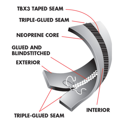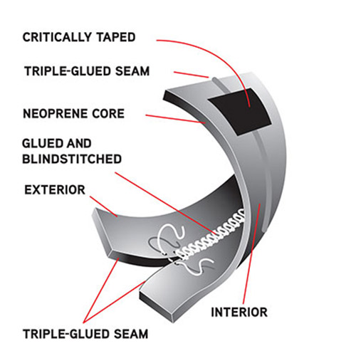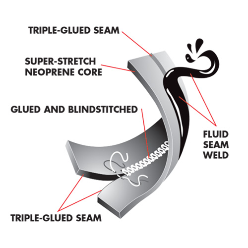This style of seam has traditionally been seen as the premium choice, creating the ultimate barrier to cold water entry. The seam is glued and blindstitched, with a specialist liquid tape then applied to either the outside or inside face. This is an extremely expensive and labour intensive method and thus fewer brands are using this technology, generally choosing GBS + internal tape in preference.