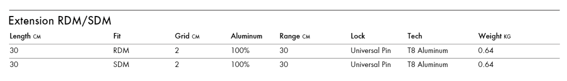 Their aluminum extensions use the same pin and collar system, stainless steel power pulley system and cleat as carbon versions. The identical stepped hole layout comes into play, making these about the most rigid aluminum extensions on the market.