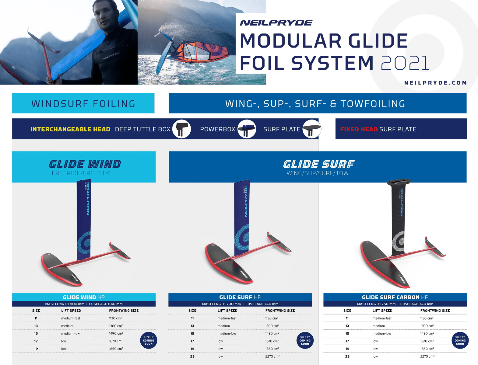 - GLIDE HP is a fully modular system so you can expand your foil setup by simply adding new wings. Glide HP now offers a range of front wings from 1100cc all the way to 2300cc to cater for every level and size of foiler. Glide Wind comes with a longer fuselage and 80cm mast for windsurf foiling and Glide Surf comes with a shorter, more maneuverable fuselage and a shorter, 70cm mast to be able to access shallower breaks.